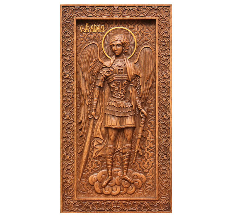 Икона «Архангел Михаил», изготовленная из натурального дерева. Православная икона ручной работы выполнена с использованием технологии 3D фрезеровки по дереву. Архангел Михаил считается верховным представителем всех ангелов и архангелов, а также покровителем усопших. В христианском мире у него молят о защите и обереге от напастей. С обратной стороны иконы возможна гравировка молитвы.