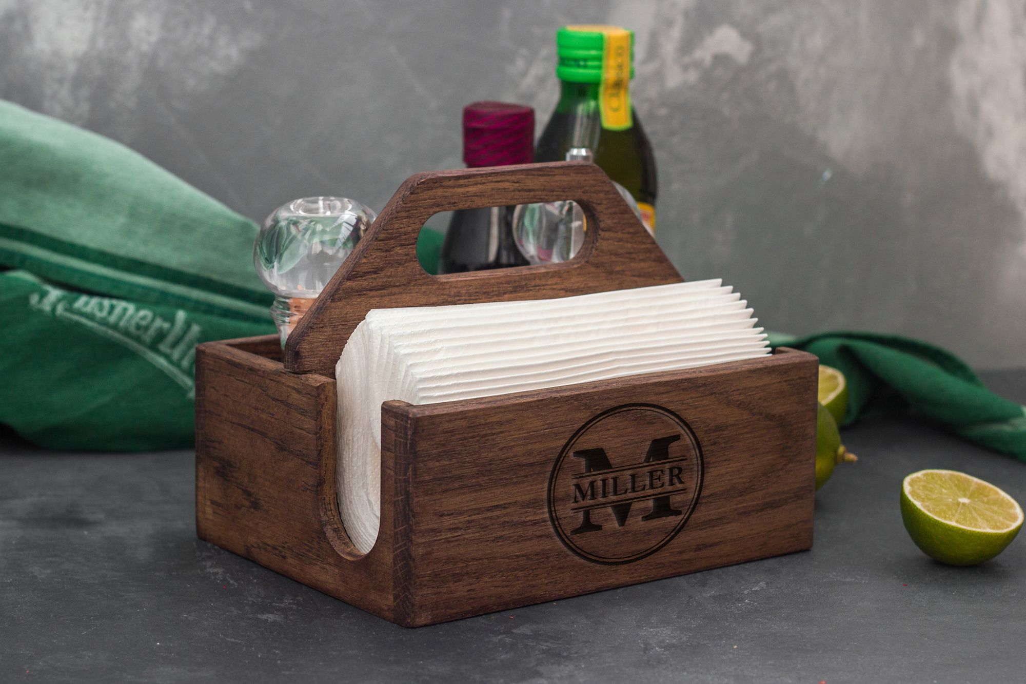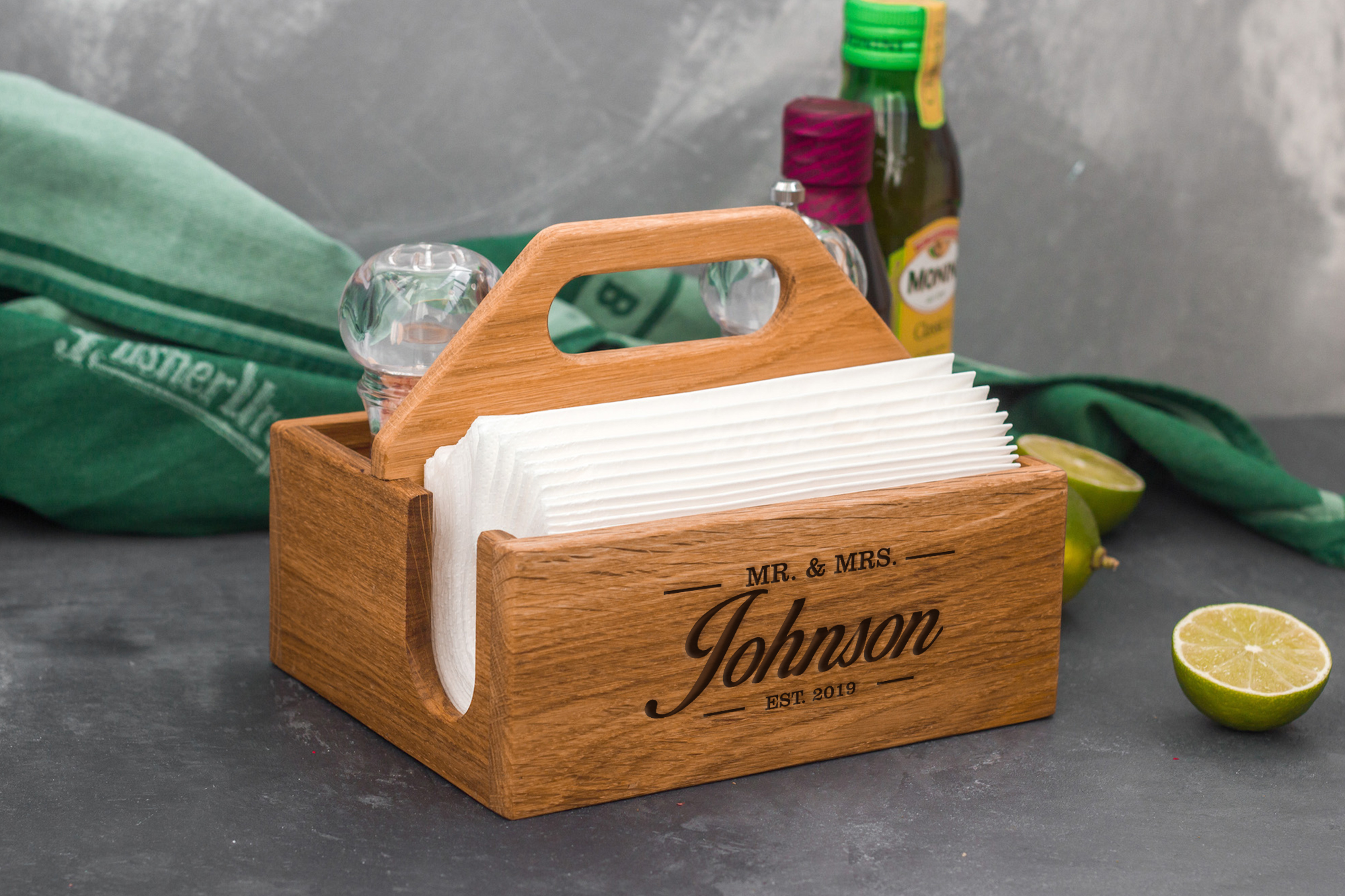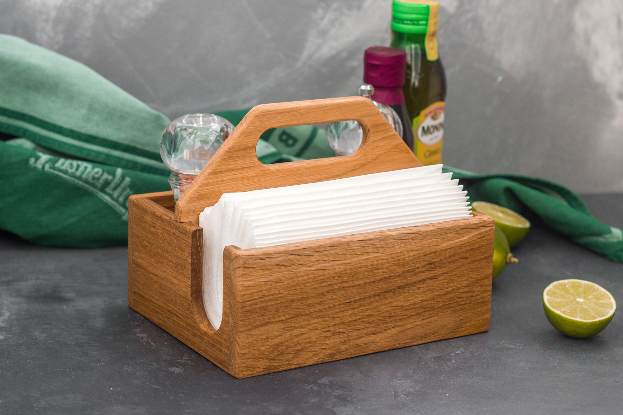 Элегантная деревянная салфетница ручной работы, выполненная из красивой и ценной породы дерева - дуба, а значит прослужит своим хозяевам долгие годы. Покрытие салфетницы - масловоск. Высококачественное покрытие не только хорошо защищает древесину, но и позволяет придать изделию очень интересный цвет, подчеркивающий текстуру дерева. В подставке предусмотрено отделение для салфеток, а также дополнительные секции, которые могут использоваться для хранения столовых приборов, чайных пакетиков, баночек и коробок с приправами, бутылочек с маслами, банки для соли и сахара, всевозможных мелочей.Варианты цвета покрытия: натуральный, дуб, венге, вишня.