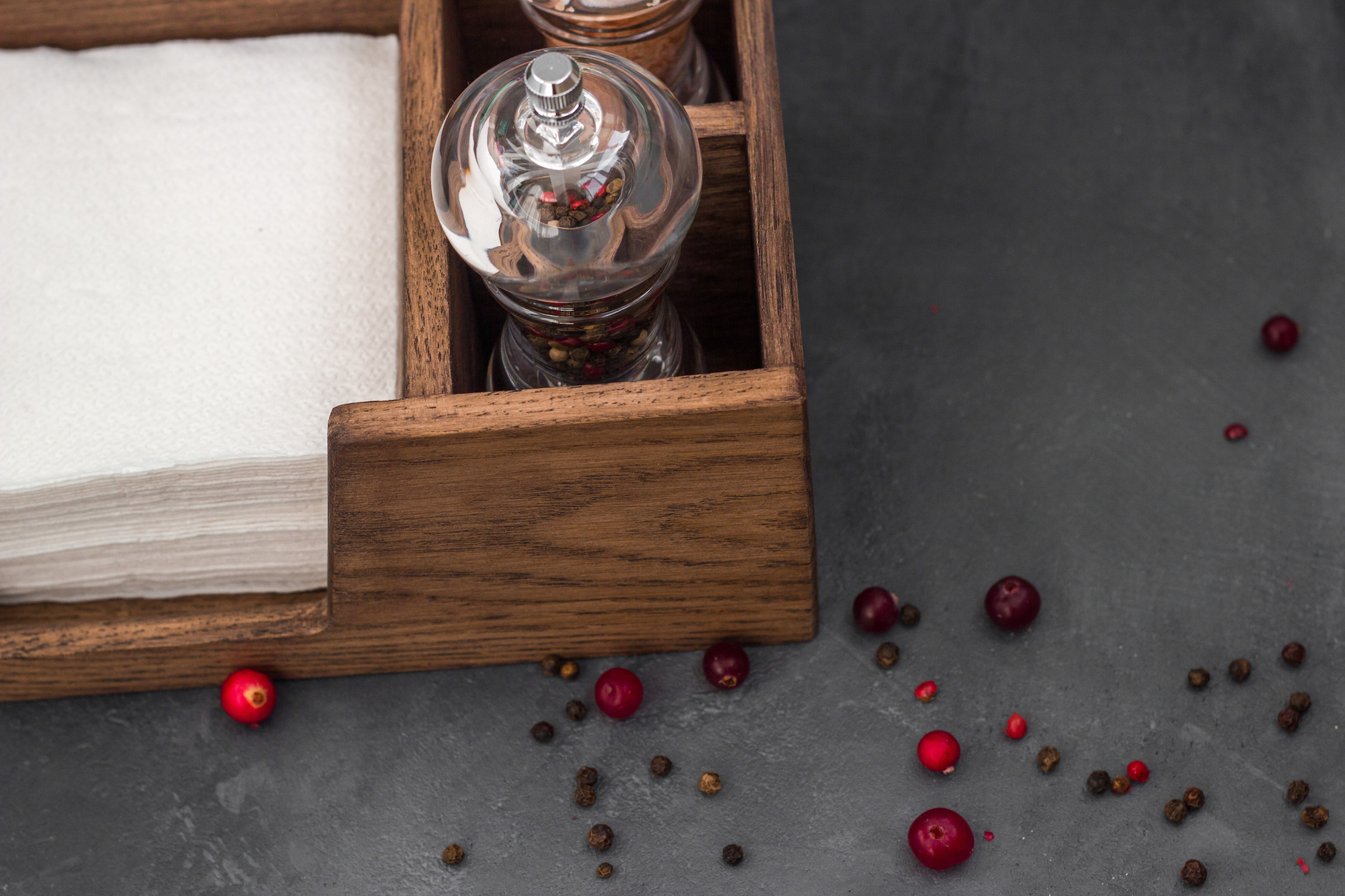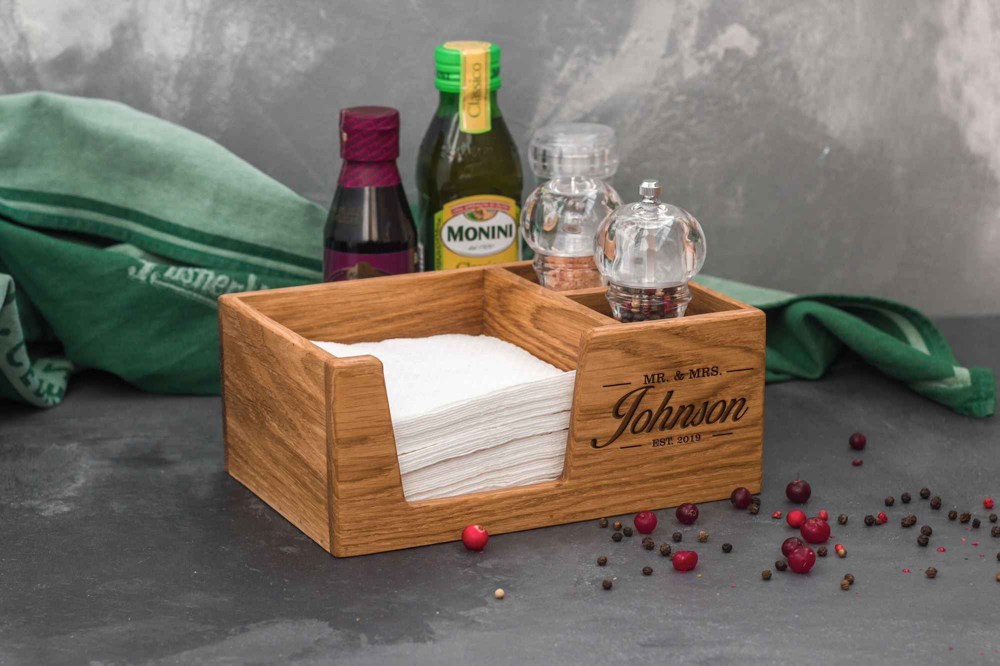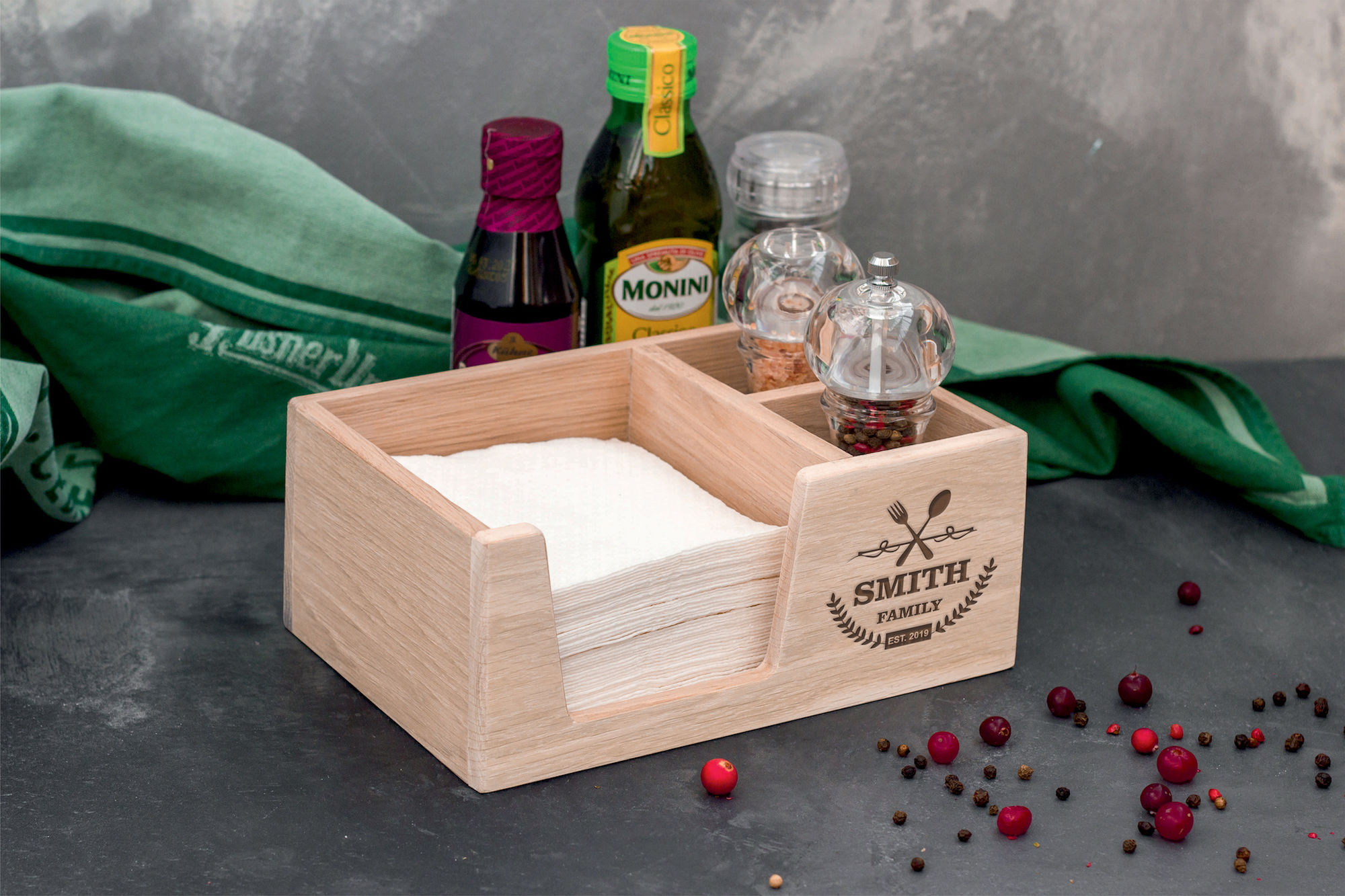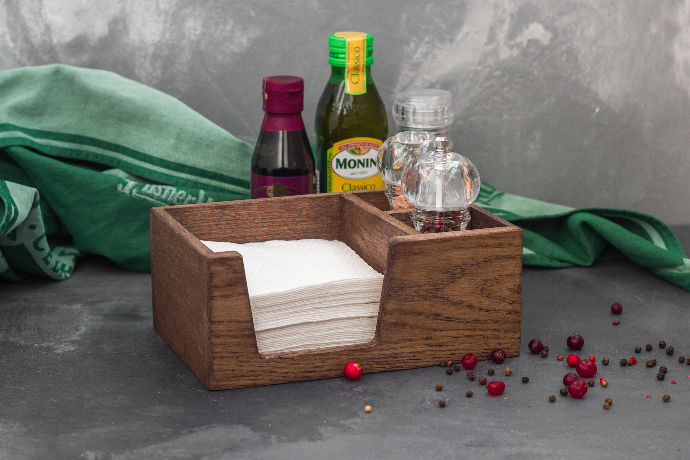 Элегантная деревянная салфетница ручной работы, выполненная из красивой и ценной породы дерева - дуба, а значит прослужит своим хозяевам долгие годы. Покрытие салфетницы - масловоск. Высококачественное покрытие не только хорошо защищает древесину, но и позволяет придать изделию очень интересный цвет, подчеркивающий текстуру дерева. В подставке предусмотрено отделение для салфеток, а также дополнительные секции, которые могут использоваться для хранения столовых приборов, чайных пакетиков, баночек и коробок с приправами, бутылочек с маслами, банки для соли и сахара, всевозможных мелочей.Варианты цвета покрытия: натуральный, дуб, венге, вишня.